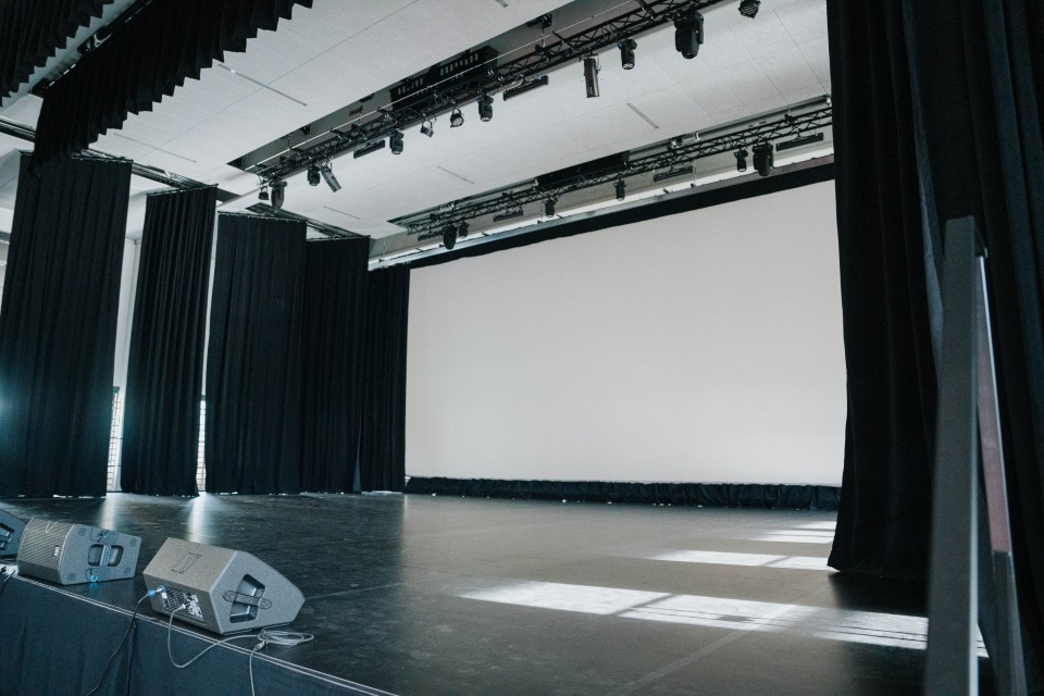 Pełne zaplecze sceniczne - rozkładana scena z kulisami, oświetleniem, projekcją tylną i nagłośnieniem.