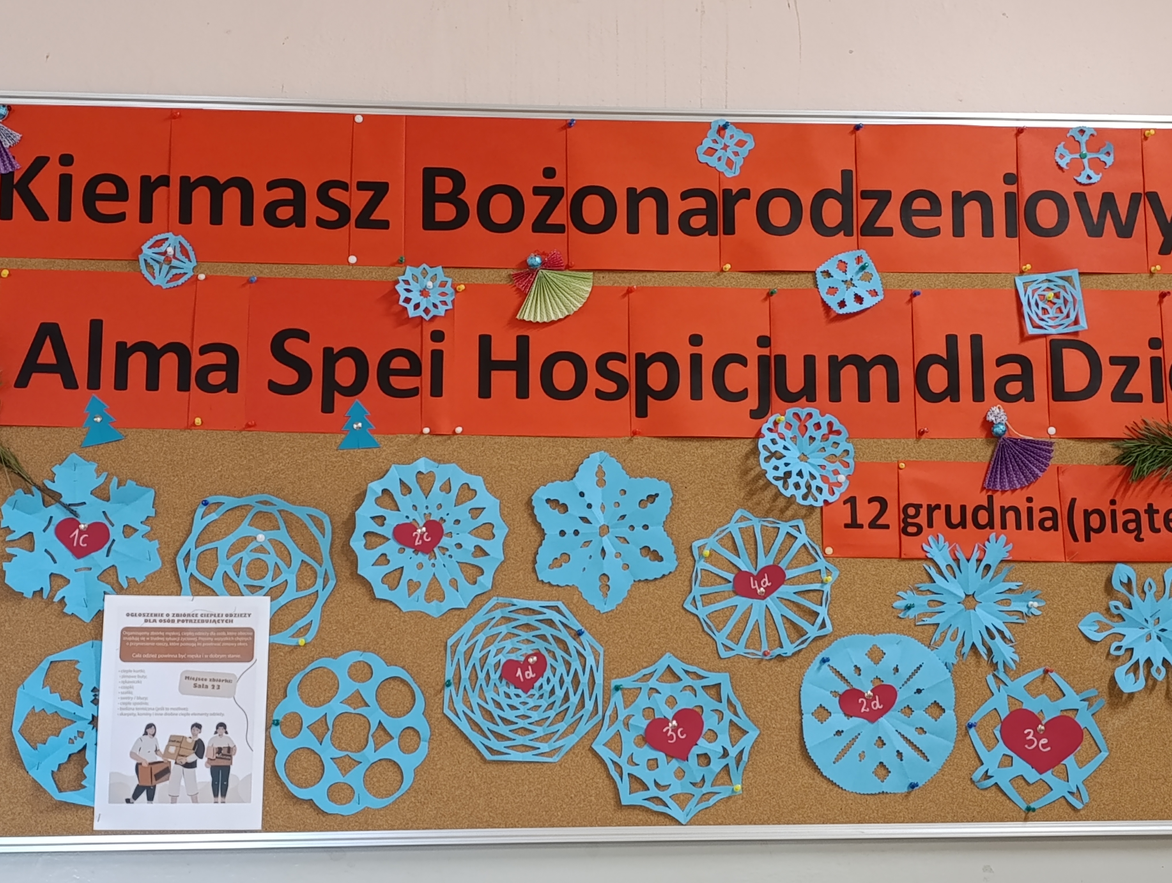 W piątek 12 grudnia w naszym liceum zapachniało świętami. Serdecznie dziękujemy Wszystkim, którzy zaangażowali się w Kiermasz Bożonarodzeniowy Alma Spei Hospicjum dla Dzieci. Pomagaliście na różne sposoby: przygotowując przysmaki, ozdoby, kartki, dzieląc się swoimi talentami. Wielu z Was pomagało przy pakowaniu darów, przygotowaniu stoiska i obsługiwaniu go - Wasza pomoc i wsparcie były niezastąpione.