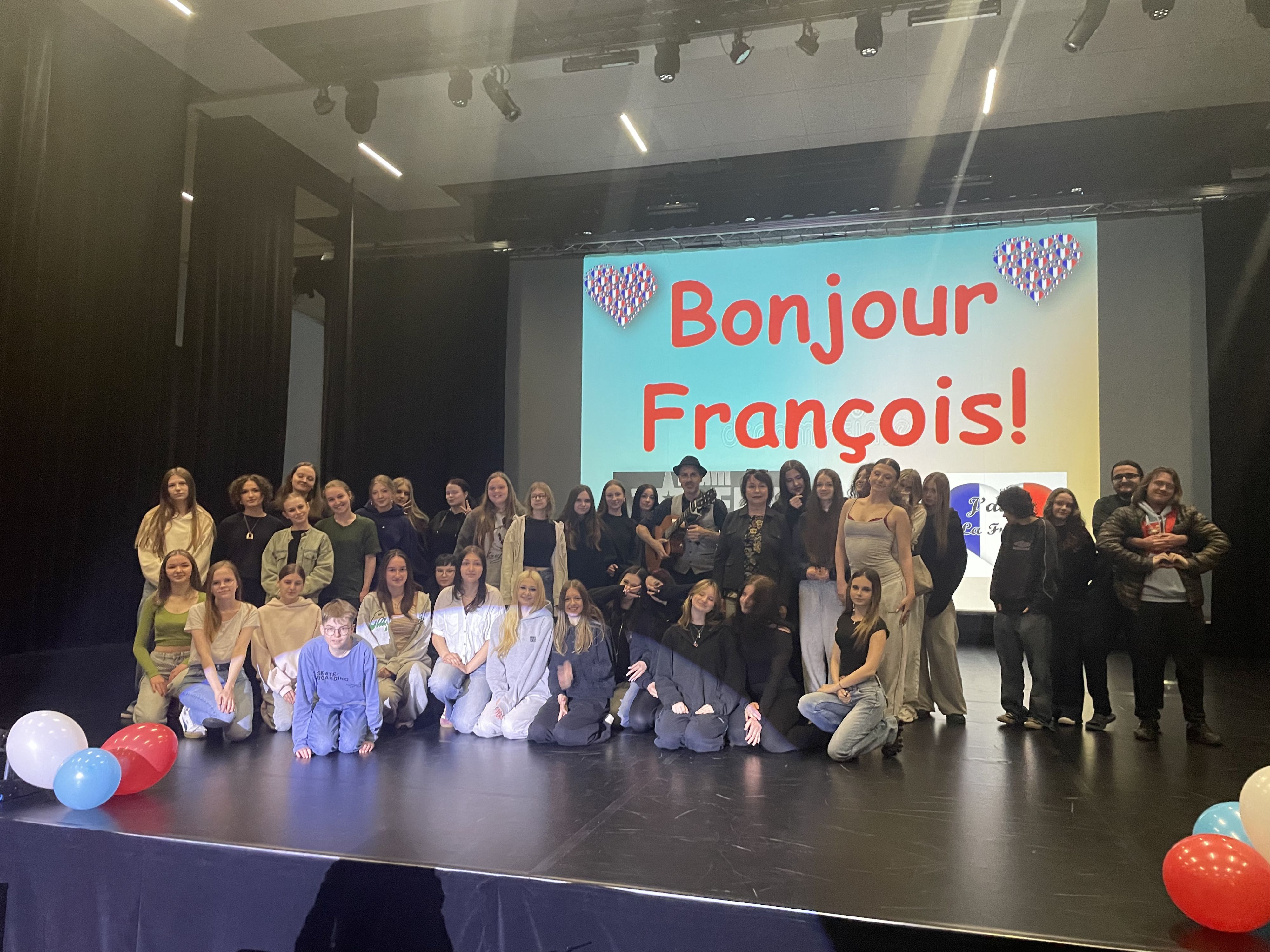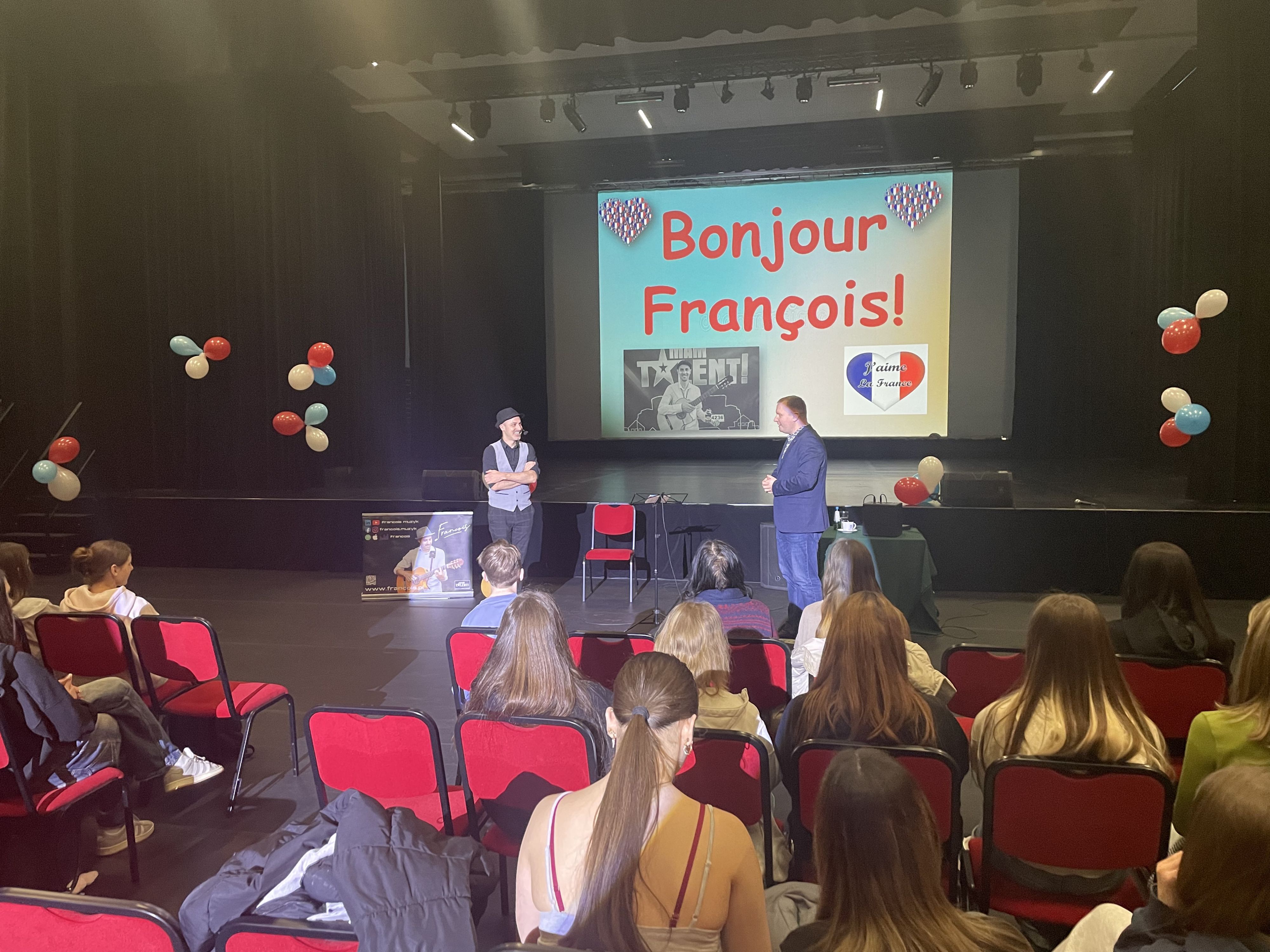 Uczniowie mieli okazję posłuchać języka francuskiego na żywo, a także aktywnie uczestniczyć w spotkaniu – zadawać pytania i wchodzić w dialog z artystą. Jednym z najbardziej poruszających momentów spotkania był wspólny występ ucznia z klasy 1D oraz François, podczas którego wykonali utwór Édith Piaf „Je ne regrette rien”.
