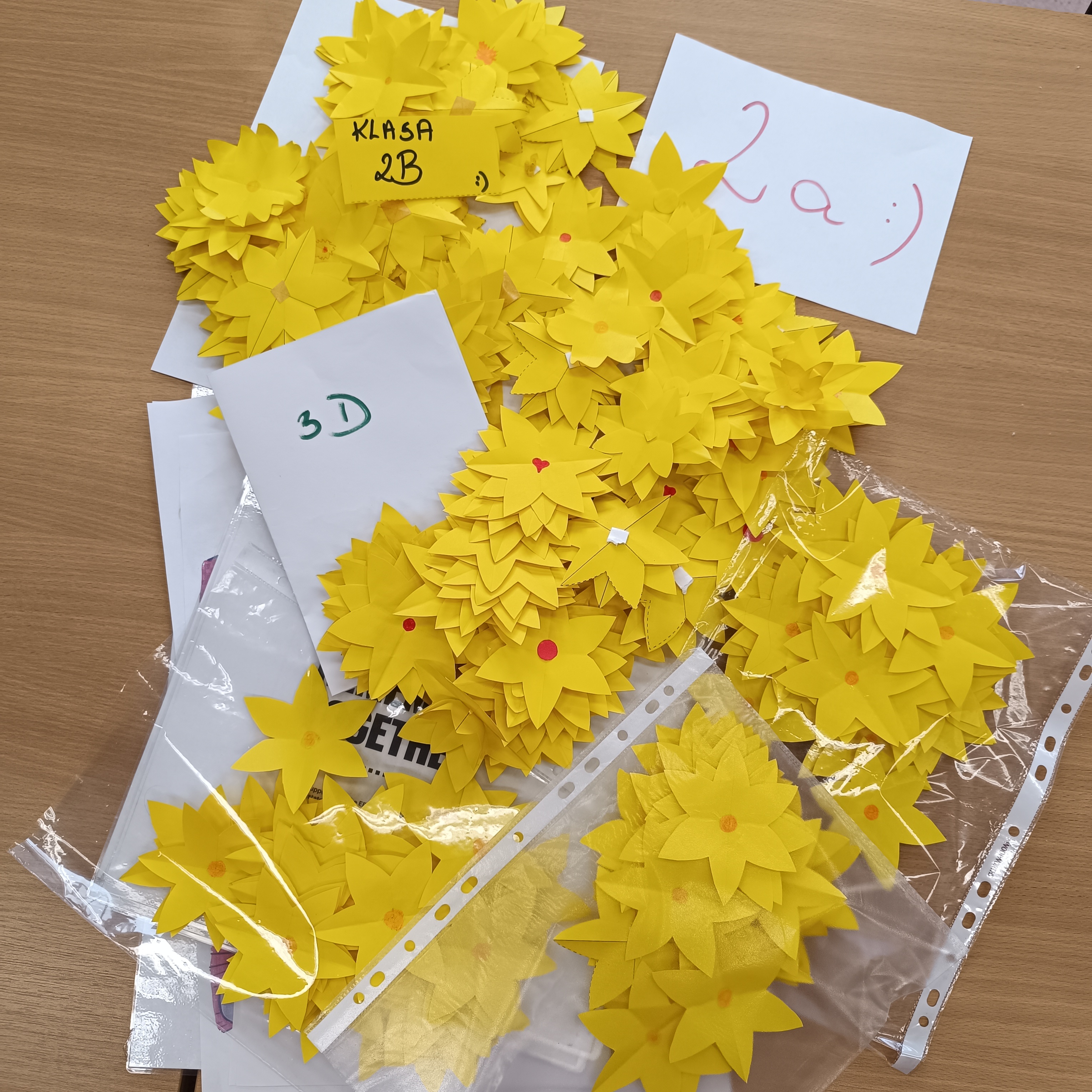 Żółte kwiaty przygotowały grupy klasowe 2a, 2b, 3a i 3d a uczniowie z klasy 1c pomogli w ich wyeksponowaniu w przestrzeni szkolnej oraz wręczali je w czasie przerw.